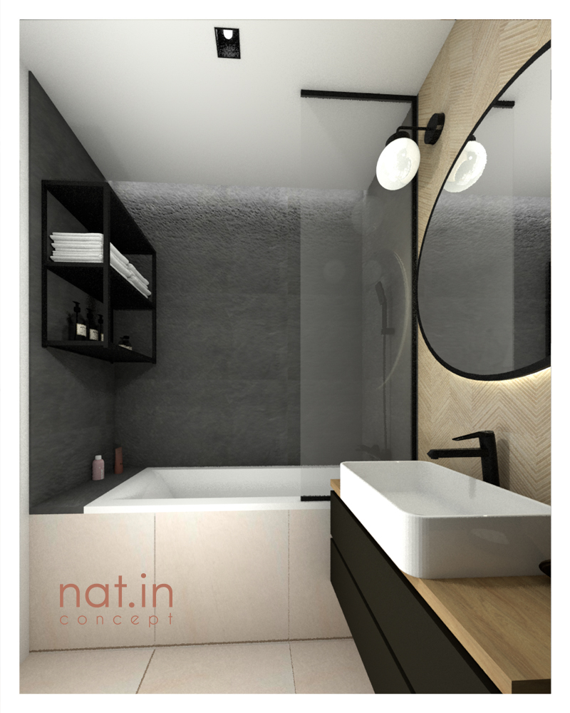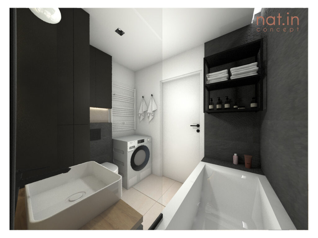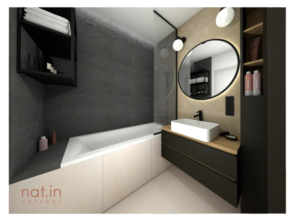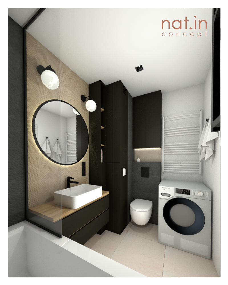 Łazienka 4 m2 w krakowskim bloku. Płytki gresowe w grafitowym odcieniu zostały skontrastowane z ciepłym beżem, dzięki czemu nie jest przytłaczająco, a bardzo przytulnie. Niewielkie domowe SPA zawdzięcza swoją atmosferę, również dzięki zastosowaniu światła dekoracyjnego, które dodatkowo wydobywa strukturę ciemnej płytki oraz ozdobnej jodełki w pasie za umywalką. Poza dekoracyjnym oświetleniem zaprojektowane zostało również oświetlenie robocze przy lustrze. Dzięki takiej konfiguracji użytkownik może dopasować przestrzeń do aktualnych potrzeb.