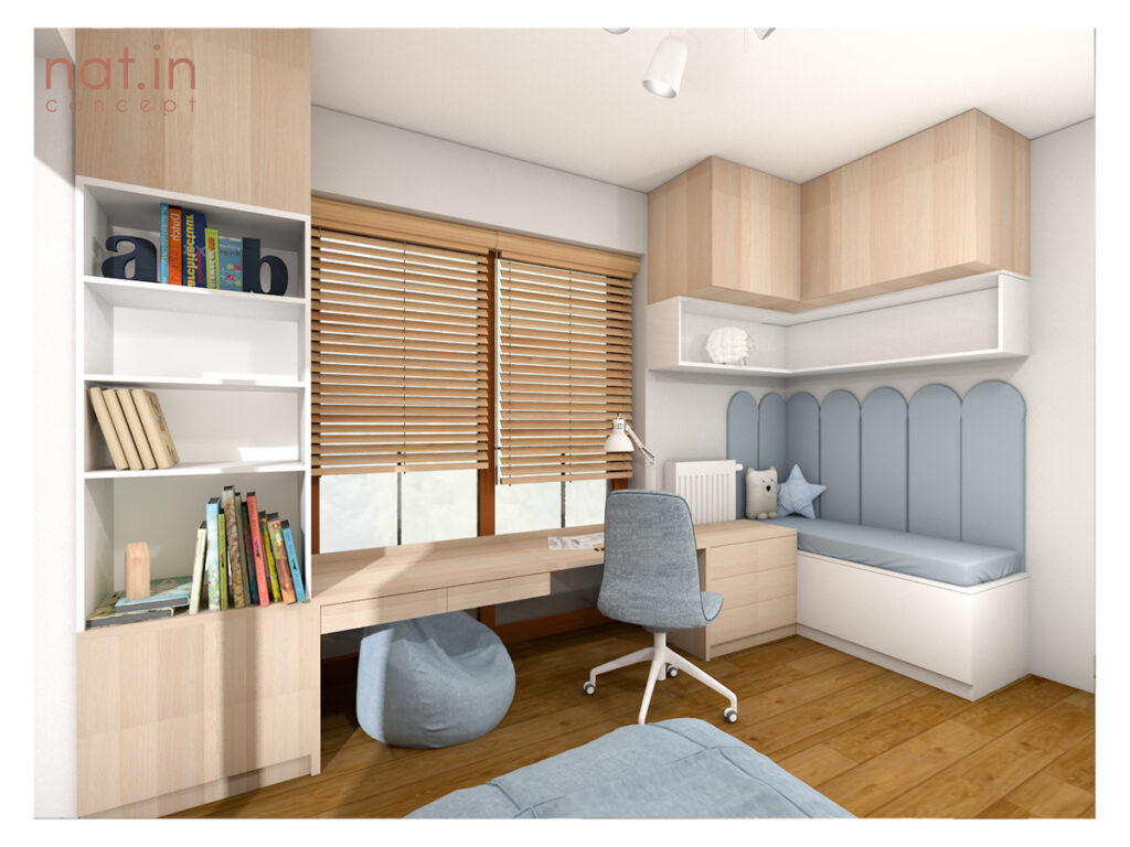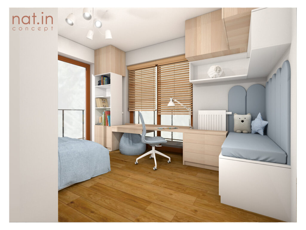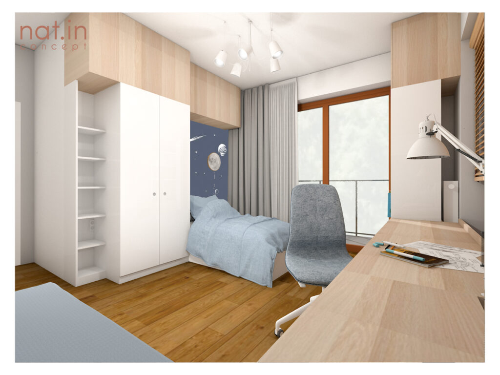 Pokój dla sześciolatka, który aktualnie interesuje się wszechświatem. Przy bardzo uniwersalnym wystroju kosmiczny akcent daje tapeta oraz księżycowy kinkiet, które z niewielkim trudem będzie można zastąpić inną tematyką. Faktem jest, że dzieci często zmieniają swoje zainteresowania. Jest to naturalny bieg, w którym młody człowiek szuka tego co już na zawsze złapie go za serce. Nie powinno się stawiać ograniczeń, a zwłaszcza w jego własnym pokoju! Dzięki takiemu rozwiązaniu chłopiec ma swój mały wszechświat, a rodzice spokojną głowę.