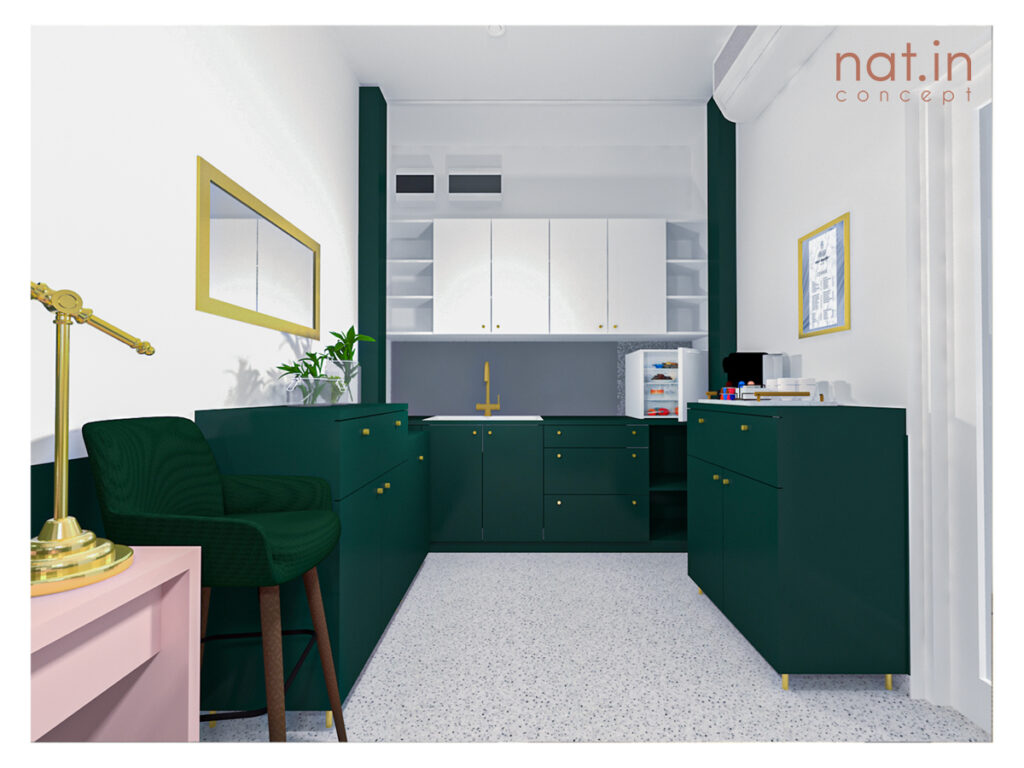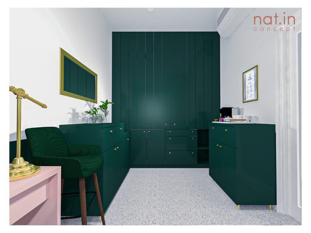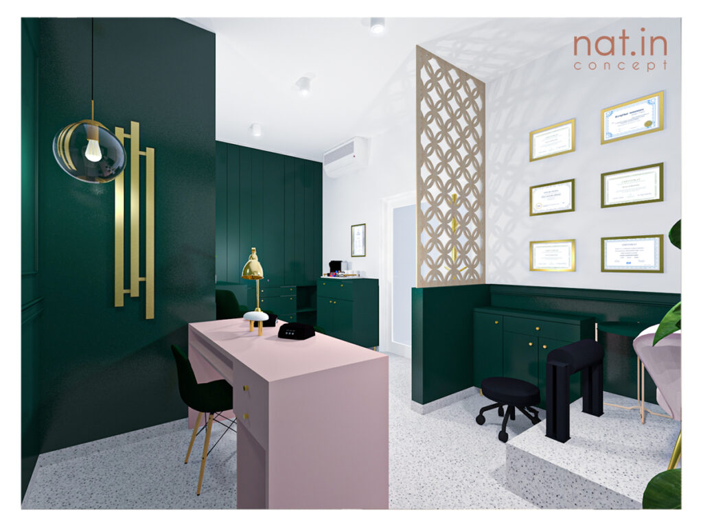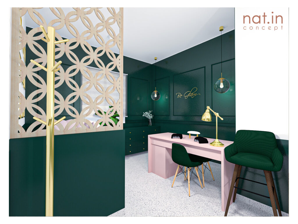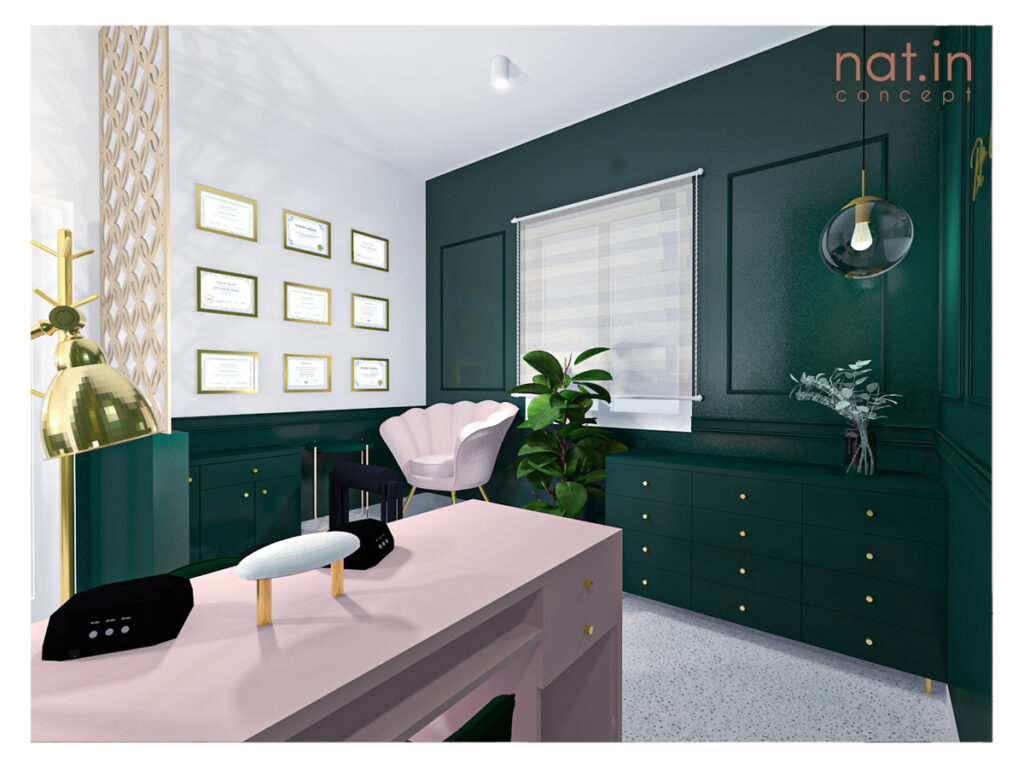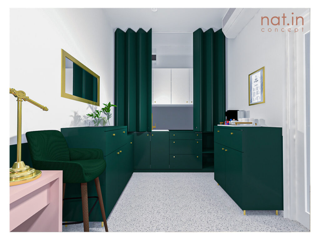 Główną wytyczną projektu było nadanie zupełnie innego wyrazu salonu i podniesienie jego standardu przy pozostawieniu dotychczasowych mebli. To zadanie projektowe było o tyle ciekawe, że poza meblami pozostać miała także nieruszona strefa zaplecza z ciągiem sanitarnym. Naszym celem było jednak zamknięcie strefy roboczej bez zmniejszenia przestrzeni salonu. Dzięki temu aktualnie do dyspozycji klientek jest większa przestrzeń bez poczucia dyskomfortu przebywania w strefie przeznaczonej dla personelu. Postanowiliśmy wydzielić strefę roboczą poprzez zamknięcie jej. Aby pogodzić wszystkie te wytyczne postanowiliśmy zastosować fronty harmonijkowe na prowadnicy mocowanej do sufitu. Dzięki temu, że fronty sięgają jedynie do wysokości blatu istniejącego dostęp do szafek oraz szuflad wciąż jest możliwy przy zamkniętej strefie. Po otwarciu fronty dzięki swojemu systemowi zajmują bardzo niewiele miejsca i nie przeszkadzają w korzystaniu z zaplecza. Taki zabieg dodaje estetyki przestrzeni nie ujmując na jej funkcjonalności.